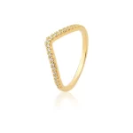 O contorno em V deste anel é adornado com pedras preciosas de brilho intenso, cuidadosamente lapidadas e ajustadas à mão. Cada pedra reflete a luz de maneira única, criando um efeito cintilante a cada movimento. Essa peça traz o equilíbrio perfeito entre delicadeza e impacto visual, ideal para complementar qualquer look.